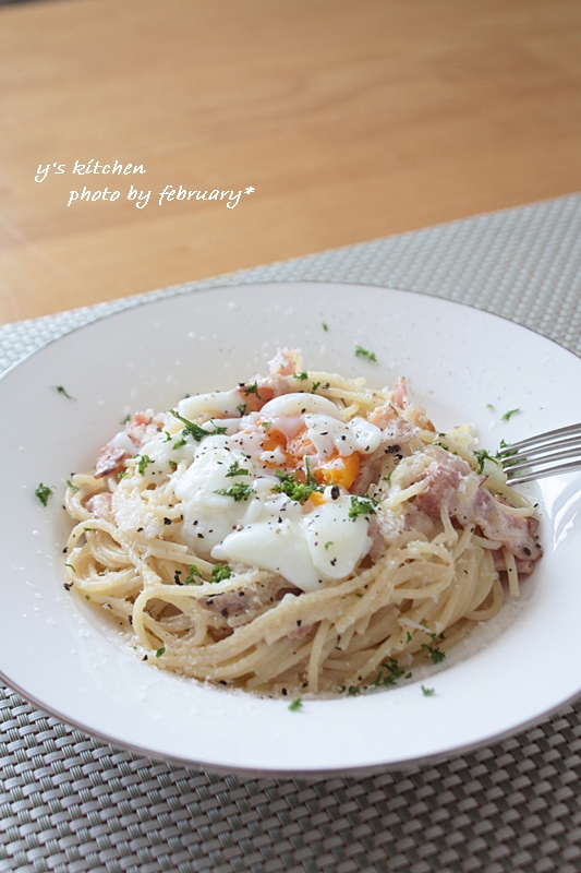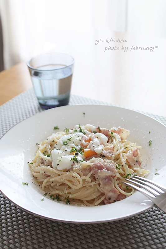 この日は 温泉卵で なんちゃってカルボナーラ。