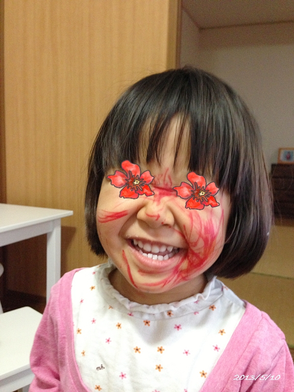赤いサインペンで顔中にお絵かきしてました。