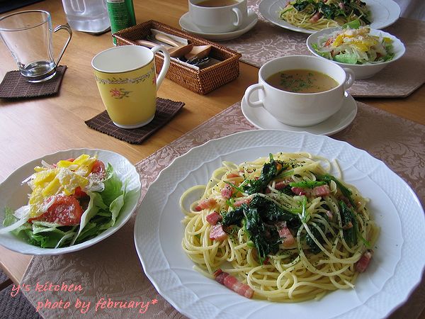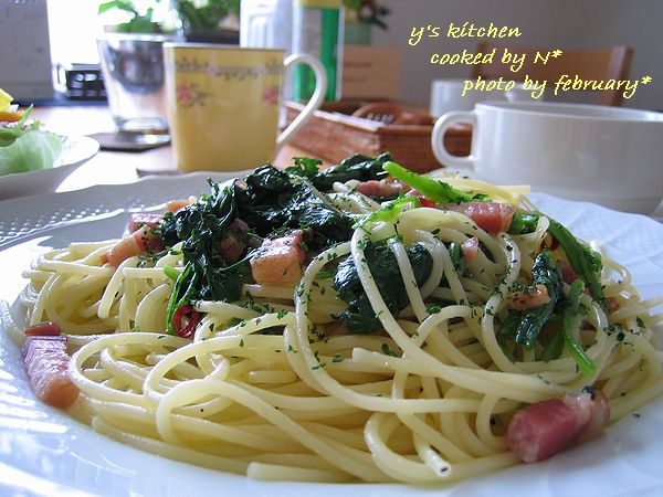 「ベーコンとほうれん草とにんにくと唐辛子でパスタを作って!」 と、お願いしました。