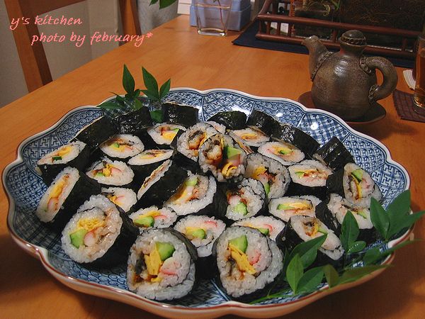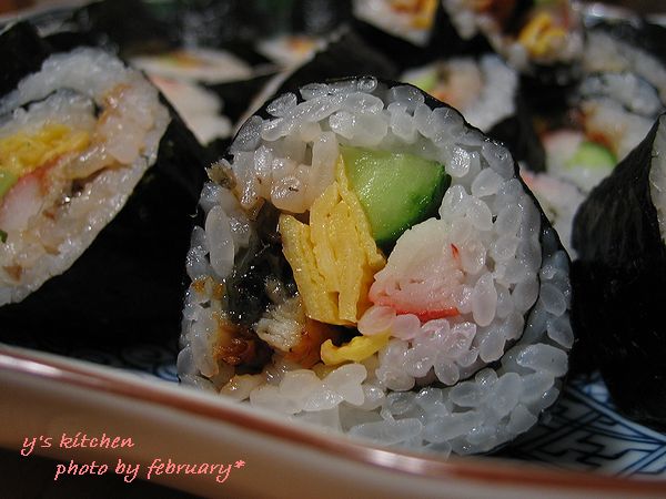 鰻、かにかま、卵、きゅうりを巻き込んであります。 お米は 2人 で 2合 をほぼ、完食 (^^;