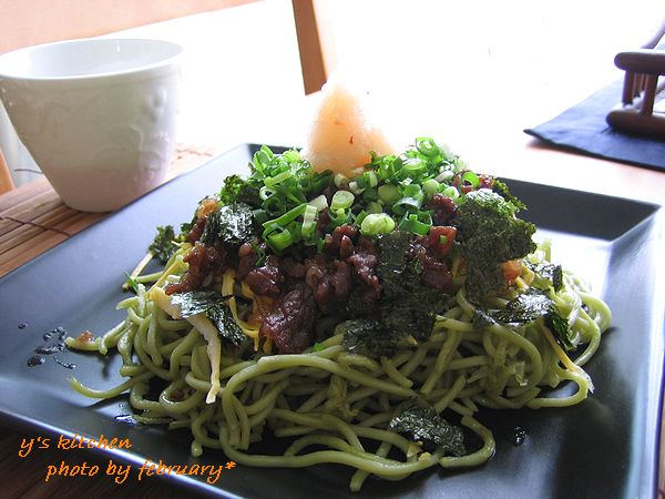 お皿に、茶そば、錦糸卵、牛肉、ねぎ、のり、もみじおろしを乗せて、