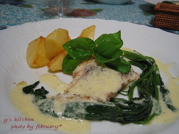 ジャガイモとほうれん草は、あらかじめ茹でておいて、フライパンでバターでソテーしてあります。