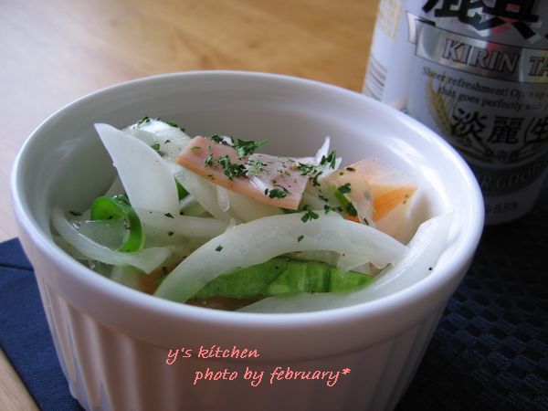 feb夫 がパスタを作ってくれている間に、私はハムのマリネを作りました。