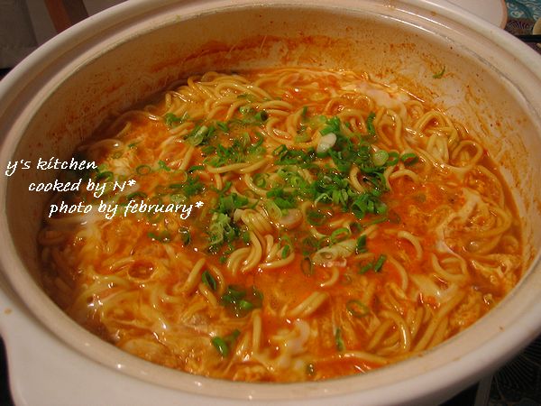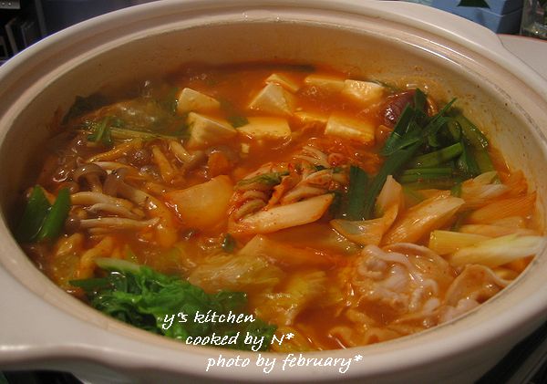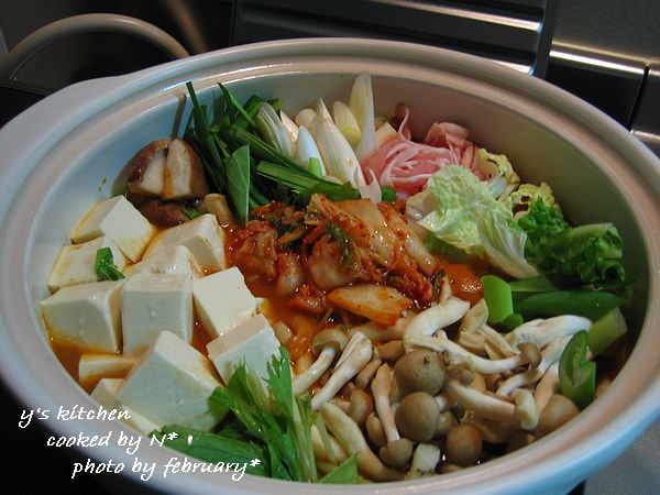 白菜、水菜、しめじ、お豆腐、ニラ、豚肉、ネギ、キムチ などを入れまして