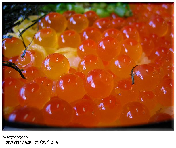 いくらの 粒々 が巨大ですわ。口の中で プチプチ はじけて汁が ピュッーと 飛びそうです。