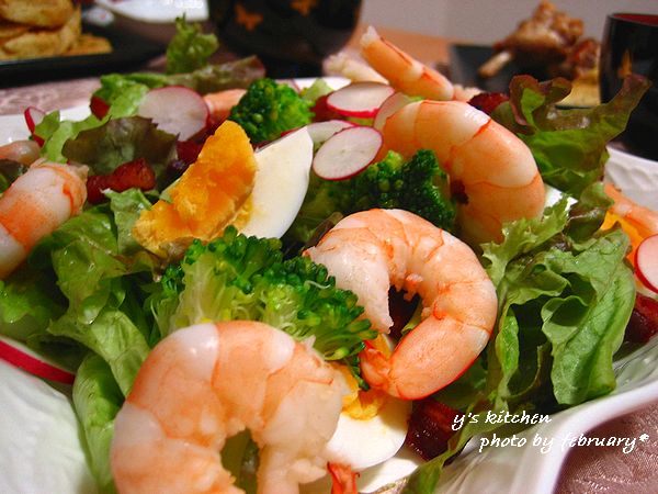 使った材料は、海老、ゆで卵、サニーレタス、ベーコン、ブロッコリー、ラディッシュなど。