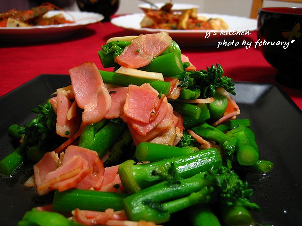 ベーコンを入れて炒め、 『はなっこりー』 を入れてざっと炒める。