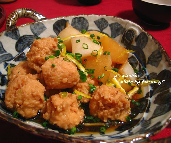食べる前に温めて、お皿に盛り付けた後、柚子の皮の千切りを散らす。