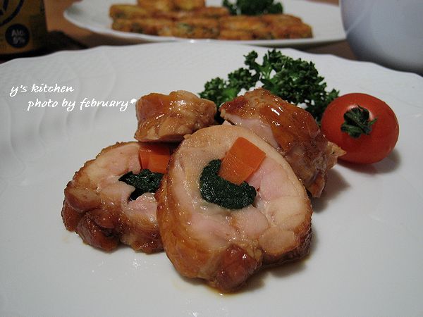 ほうれん草とにんじんを置き、鶏肉を巻いてタコ糸でしばる