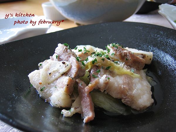 豚バラ肉とキャベツとニンニクを、 LE CREUSET のお鍋で蒸し煮してみました。
