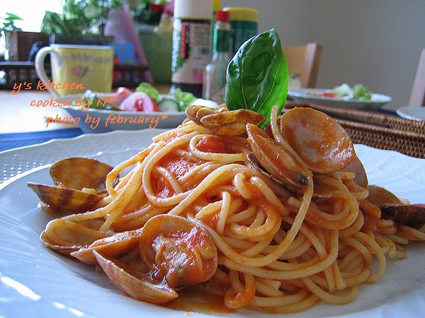 14. あらたなフライパンにトマトソース、あさり、パスタをいれ全体を混ぜ合わせる