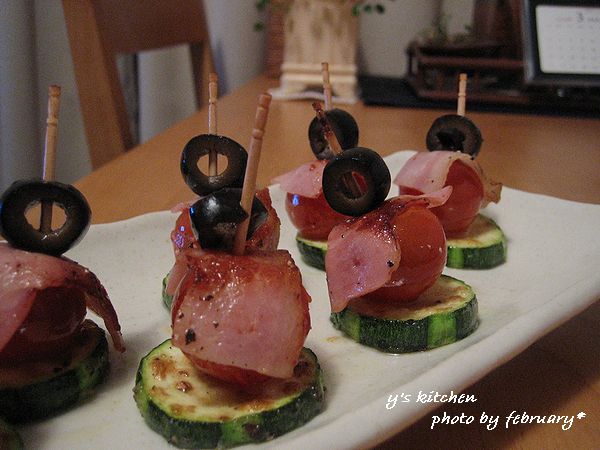 カットしたブラックオリーブ、ベーコン、ミニトマト、ズッキーニを楊枝で刺して出来上がり。
