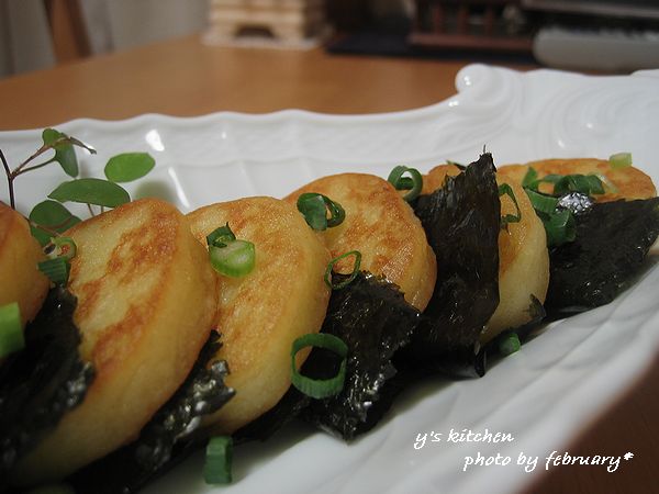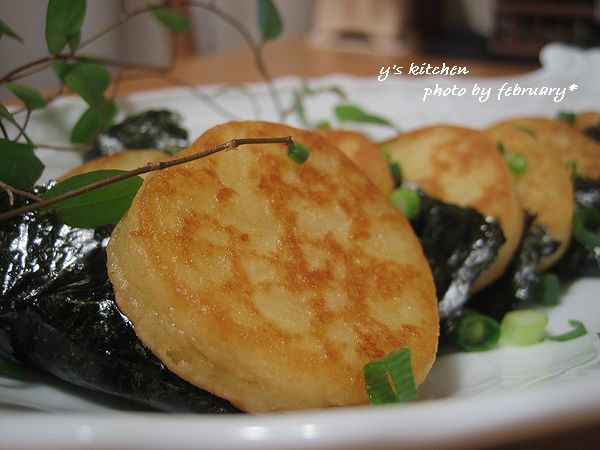 4. 一口大に切ってフライパンにバターを溶かして焼き、海苔を巻いて できあがり