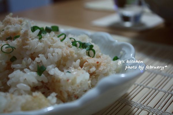 1. 米を研いで分量の水、調味料、汁気を切ったかに缶、みじん切りにしたしょうがを