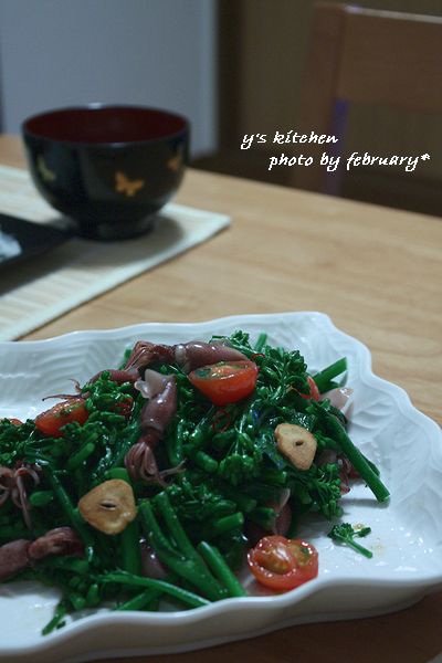 茹でておいた はなっこりー の茎の部分を炒め、プチトマト、ホタルイカ、赤唐辛子、
