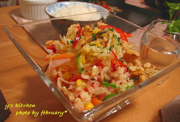 他には、ハム、パプリカ(赤)、ピーマン、コーン、くるみ、にんじんなどが入っています。