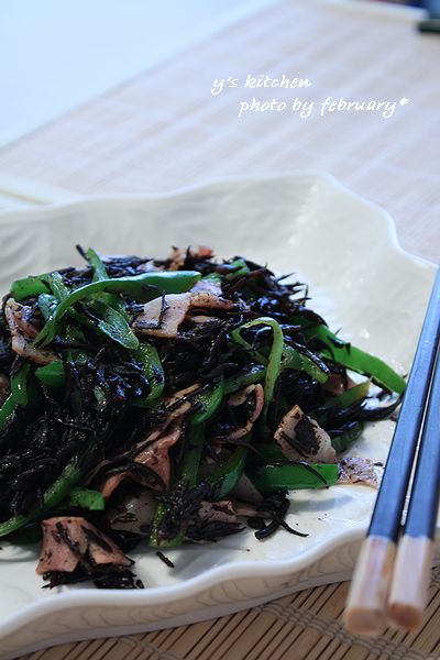 5. ピーマンを入れて炒めて、1分後にひじきを入れて炒める