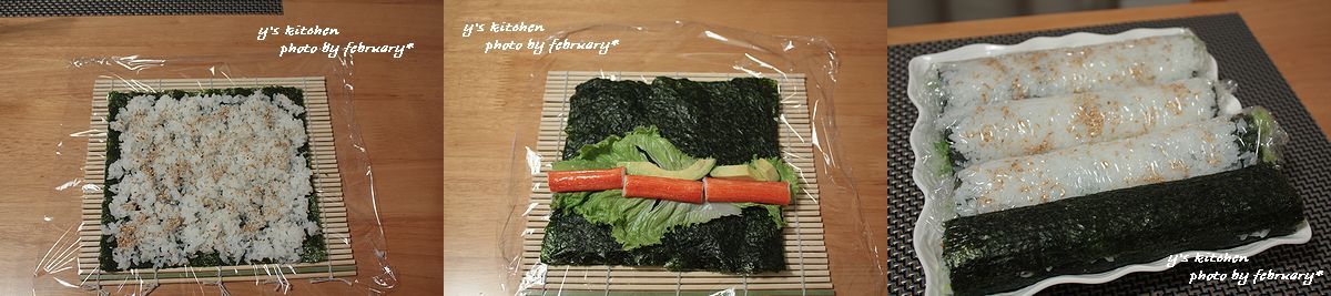 1. 巻きすの上に、海苔、酢飯、白ゴマを乗せる