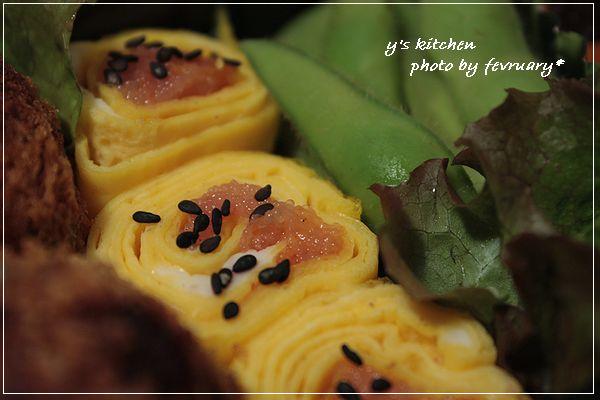 ほぐした明太子を乗せて、巻きすで巻いてしばらく置いておき、