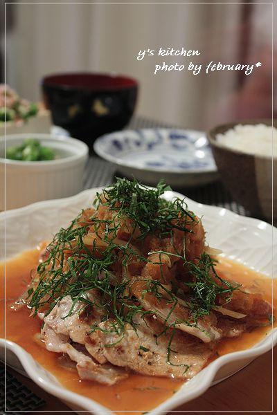 そこにおろしソースを入れて温めて、お肉の上にかけて、大葉を散らせば出来上がり。