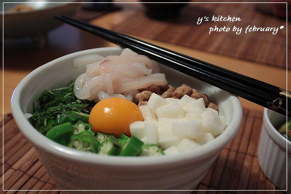 スルメイカ、納豆、長いも、オクラ、大葉、刻み海苔、卵を乗せて