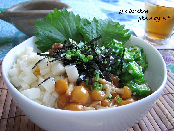 feb夫 のお昼に出したとき時は、シソ、のり、小葱、納豆、長いも、オクラ、なめこ を乗せてます。