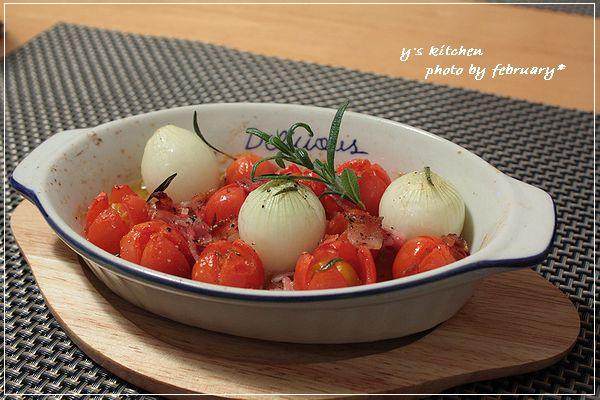 ベーコン は、2mm角に切って、ペコロスとプチトマトを耐熱皿に入れ、