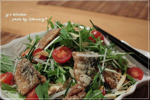 そして片栗粉をまぶして180度の油で2~3分揚げて、水菜、大根、プチトマト、