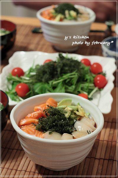 サーモンとホタテとアボカドと共に丼ものにして、わさび醤油で頂きました。