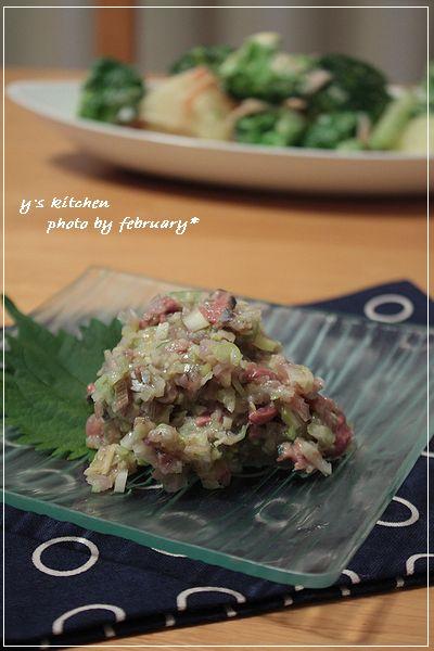 みじん切りのネギ、みょうが、しょうが、大葉などと一緒にたたいて
