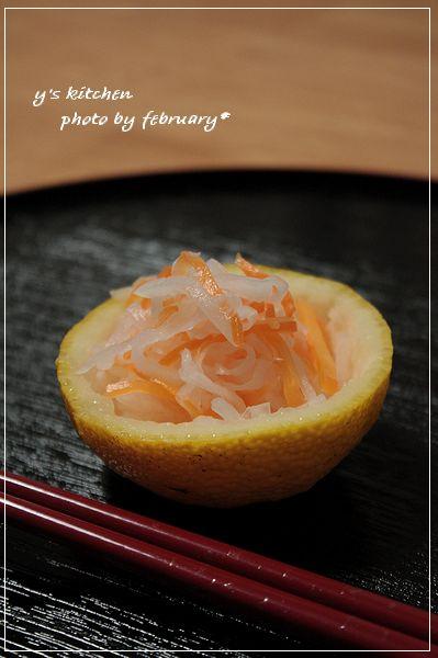 3. ゆずは半分にして中をくりぬいて絞り、外側は器に使う