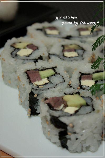 前日に焼いた ローストビーフ を 使って 裏巻きロール寿司。