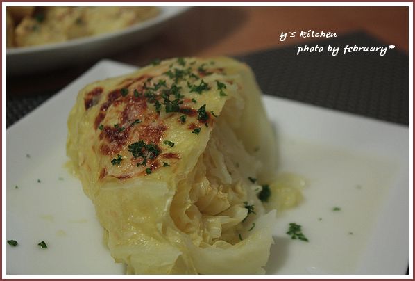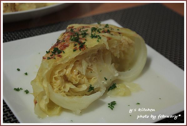 キャベツはコンソメスープで 10分間 蒸し煮したあと、