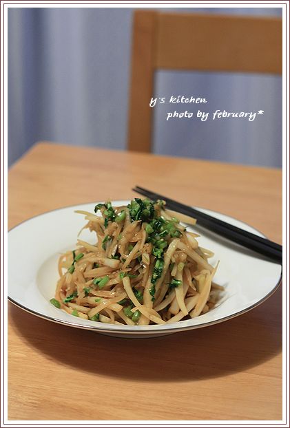 ごま油 で 炒めて、途中で 大根の葉 も 加えて、 お醤油 と お酒 で 味付け。