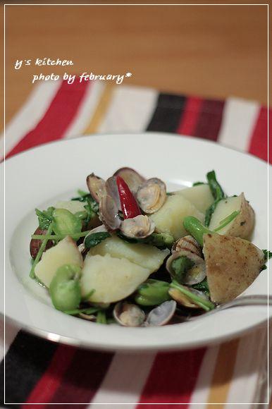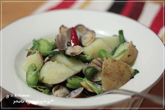 あらかじめ茹でておいた皮付きのじゃがいも、空豆、種を抜いた赤唐辛子、を入れて