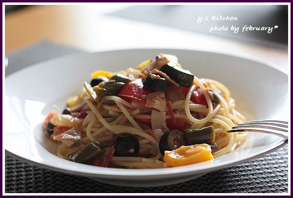 翌日のランチは、余った カポナータ で パスタ。