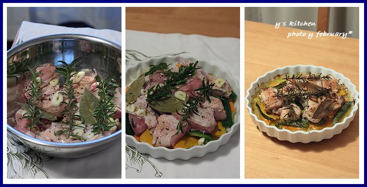 ローズマリー、ベイリーフを乗せて上からオリーブオイルをかけ、