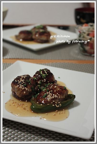 お皿に盛り付けた肉詰めにかけ、白い煎りごま、万能ねぎなどを散らして