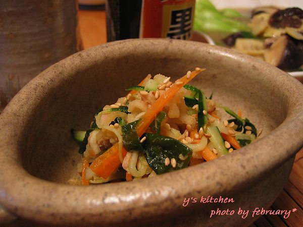 味付けは、お酢、お醤油、ごま油、お砂糖、ゴマ、です。 分量はてきとー。