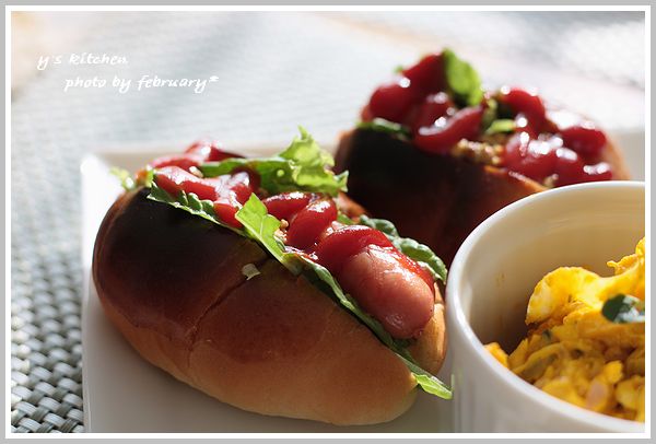 はさんで、粒マスタード と ケチャップ で 味付け。