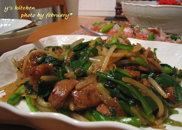 7. ニラともやしの水気を切り、フライパンに投入して炒める