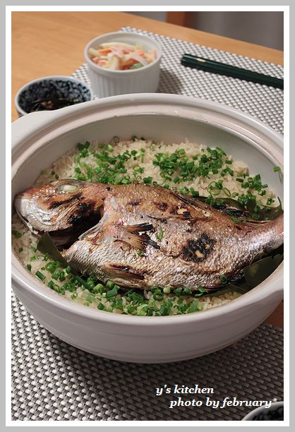 を 入れてかき混ぜ、昆布をお米の上に乗せ、その上に焼いた鯛を置く