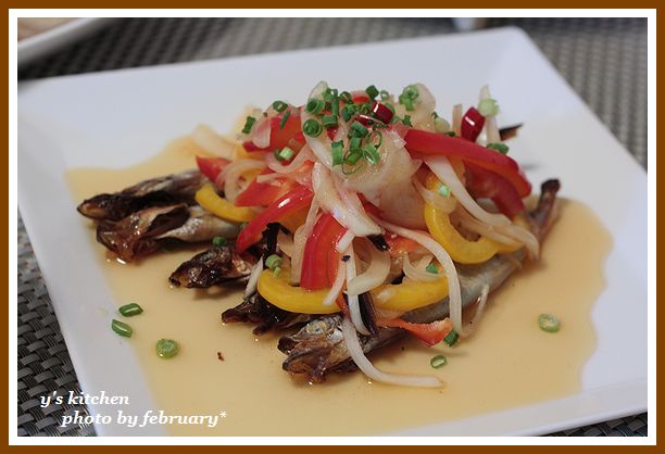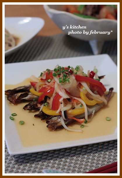 アツアツ の ししゃも を 甘酢に ドボン と 漬けていきます。