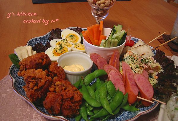 基本的には変わってないんだけど、鶏の唐揚げと、ポテトサラダのみ私作で、あとは feb夫 が