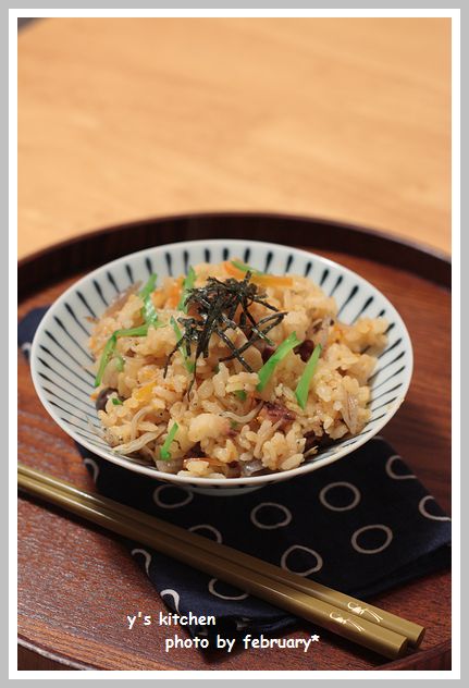 ウニ、じゃこ、たこ、にんじん、こんにゃく、しめじ を 一緒に炊き込んで、