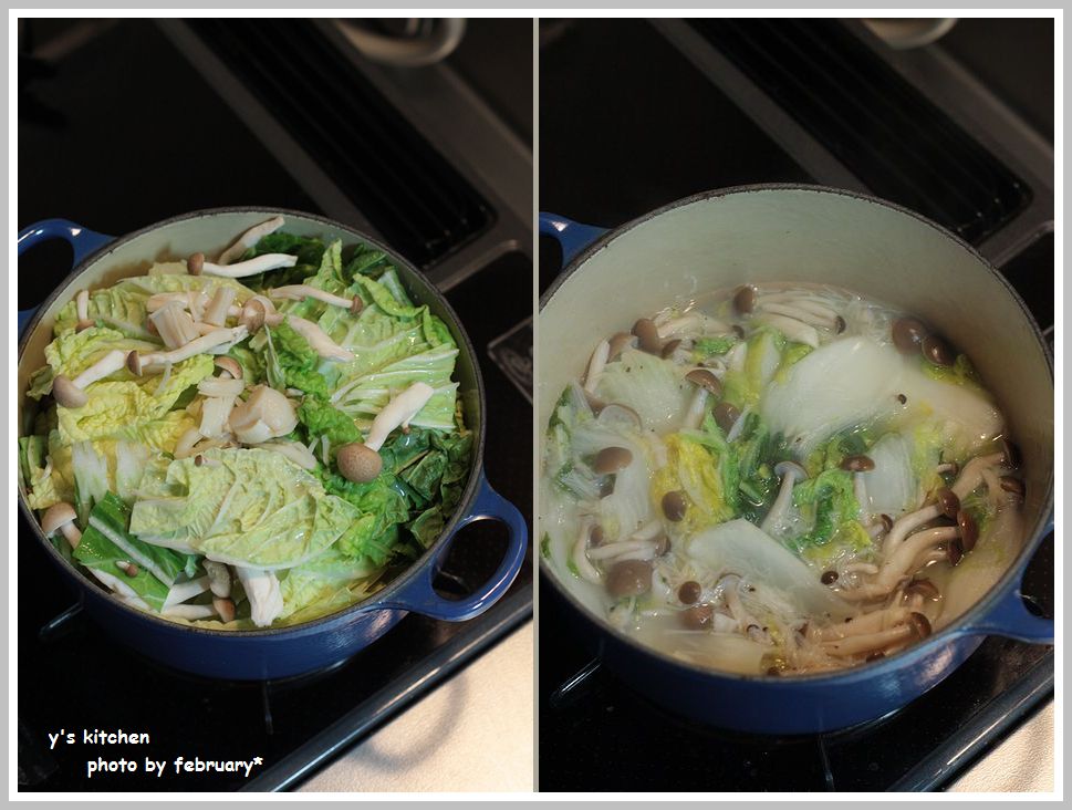 ● 厚手の鍋に、白菜の芯を下の方に敷き詰める