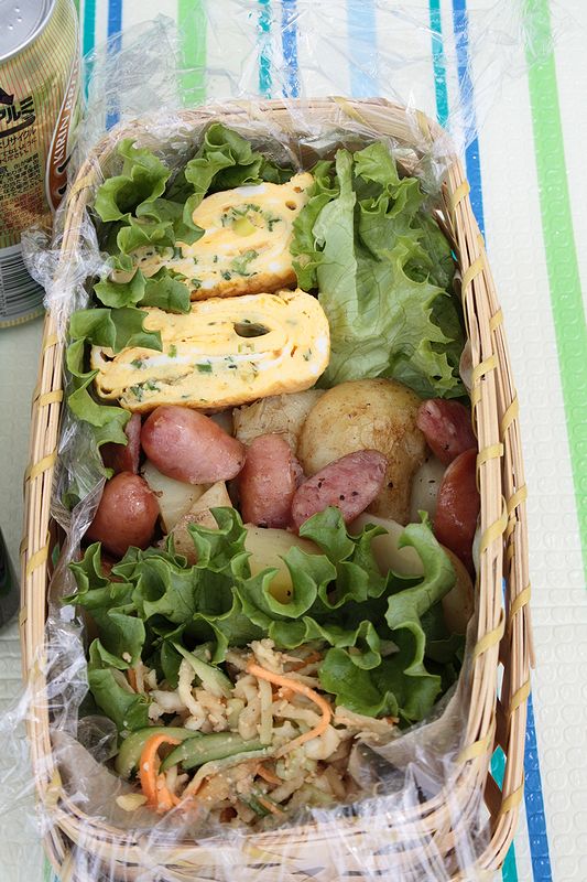 おかずは、マカロニサラダ、切干大根のゴマサラダ、じゃがいもとソーセージの蒸し焼き、