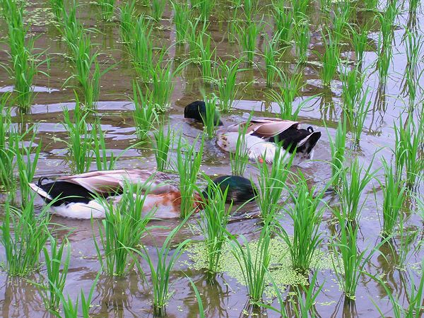 いつもくっついて田んぼの中の何かを食べている。 鳥のお陰で農薬要らずということらしい。