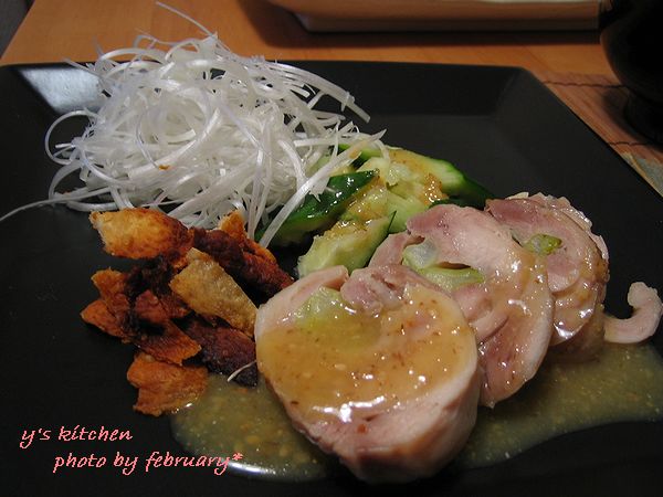 2の白髪ねぎと、5の皮を乗せ、ごま酢だれをかける