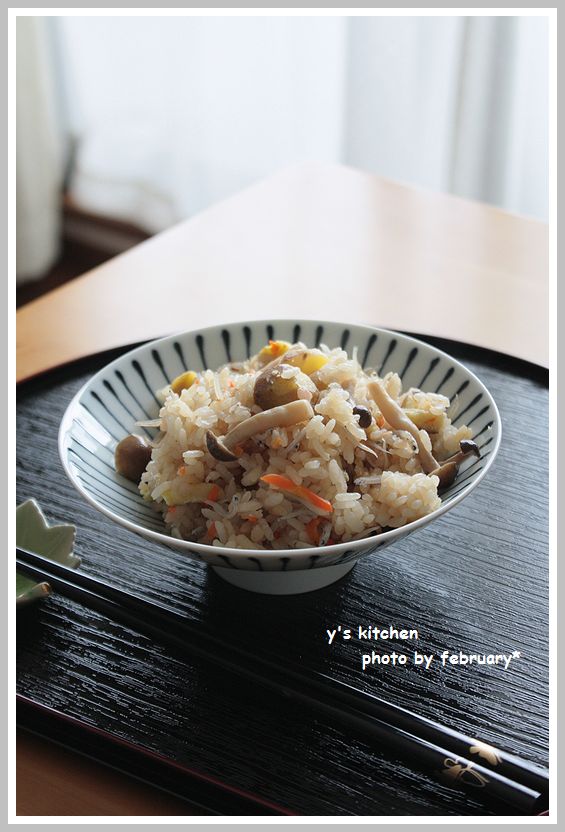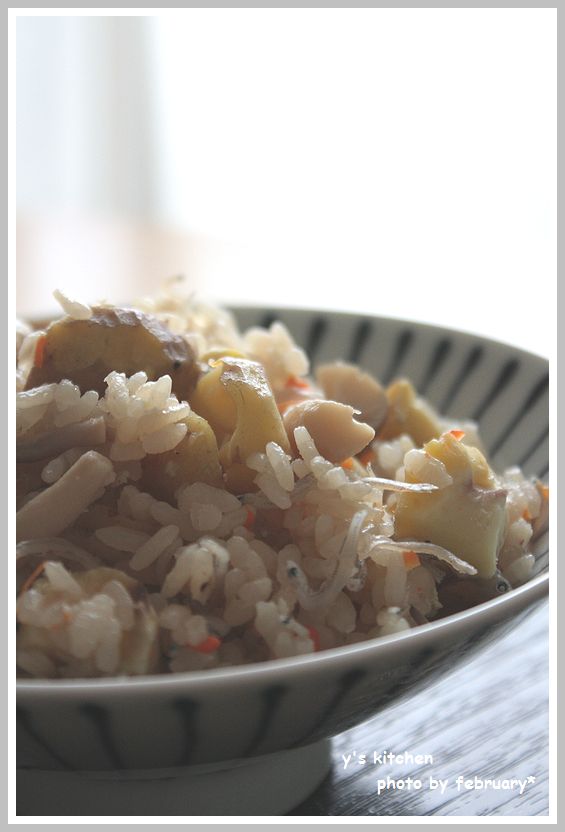 栗、しめじ、じゃこ、にんじん、ごぼう かな?